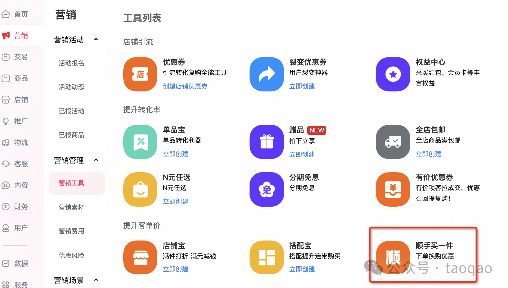 - 點(diǎn)擊進(jìn)入營(yíng)銷工具,選擇進(jìn)入【順手買一件】頁(yè)面,查看已開通的活動(dòng)。